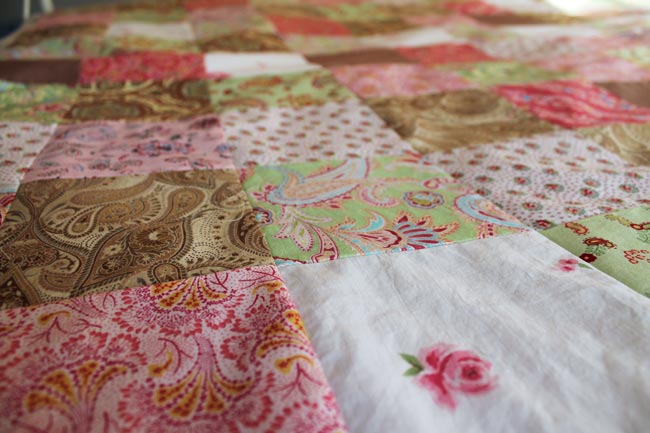 I started making this quilt around the time I took the quilting class. I first imagined it as a random pattern of pink and green patterned squares with circular appliqués. So, 7 years later I've finished piecing the squares.